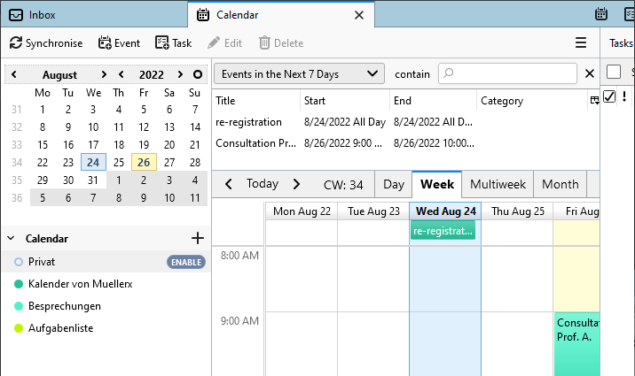 The integrated calendars appear in the left column and are synchronized directly. The entries can be seen in the overview on the right.