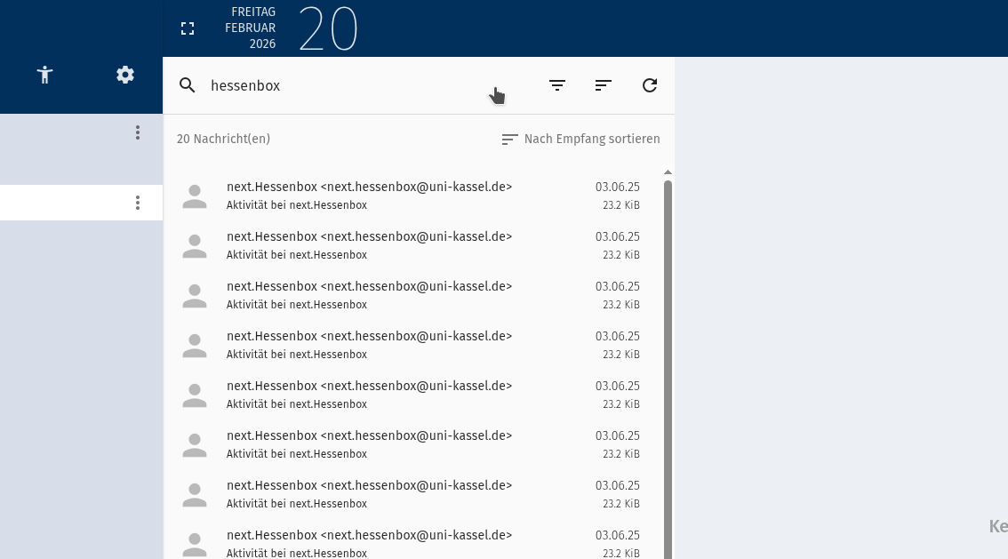 Emails are listed chronologically and line by line. The appearance and operation of the inbox does not differ from the operation of the other mail folders. Individual emails can be selected for certain actions (e.g. moving, deleting, ...) by marking the box at the beginning of the line.