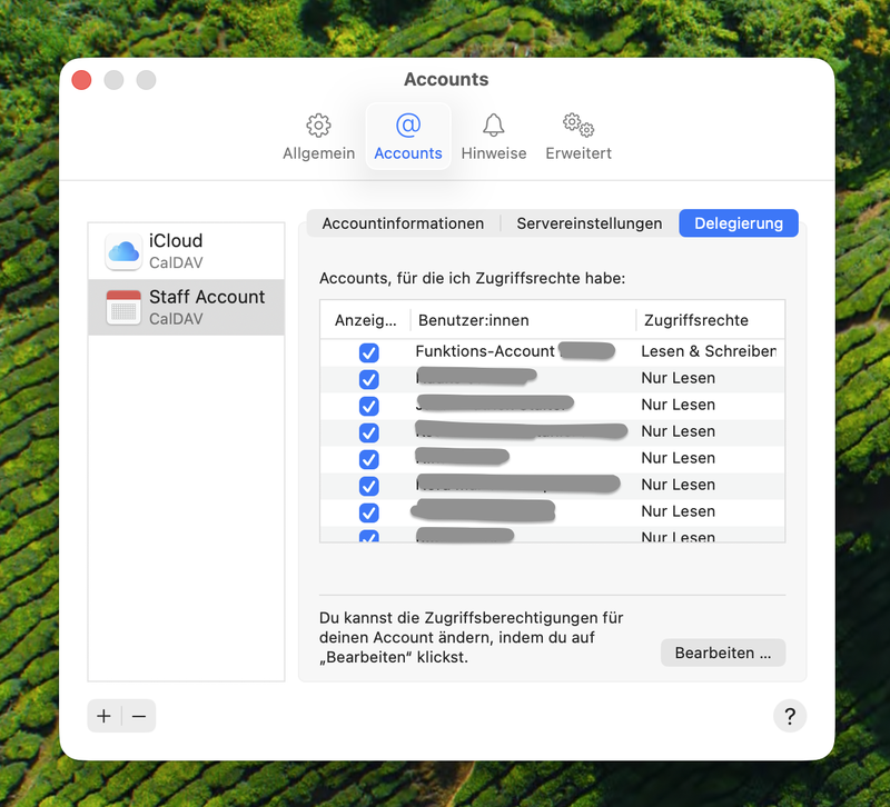 Under MacOS 26, the delegation item is not found in the account settings, but rather from the calendar app under “Settings” -> “Account” -> “Delegation”.