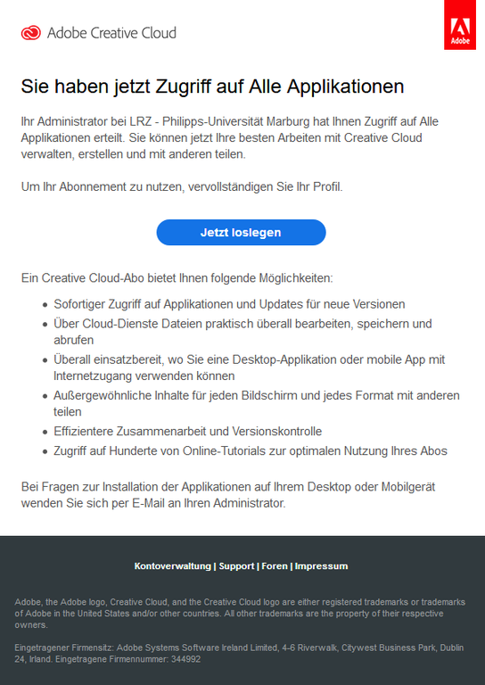 Once your account has been created, you will receive a system message from message@adobe.com with the subject " Sie haben jetzt Zugriff auf Alle Applikationen – viel Erfolg!” (You now have access to all applications - good luck!)
