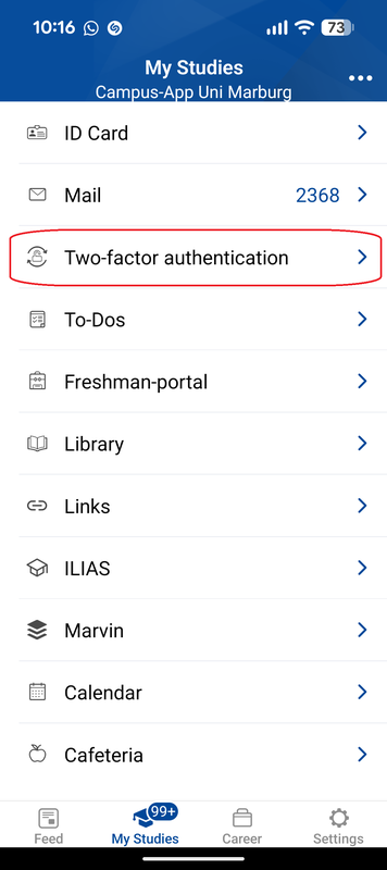 6. After successfully scanning the QR code, you will find an entry labeled “Philipps University of Marburg” under the “Two-Factor Authentication” module. It will display a time-based one-time password in the form of an 8-digit number that changes every 30 seconds. You can now use this token for future logins requiring two-factor authentication.