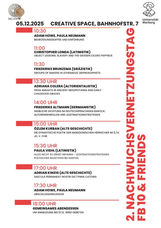 The first networking day for early-career researchers from MCAW, FB10, and CNMS took place on November 29, 2024, in room 00A16 at CNMS (Deutschhausstraße 12). It was organized by Henrike Arnold (Classics/Greek Studies) and Adam Howe (Ancient Near Eastern Studies).
